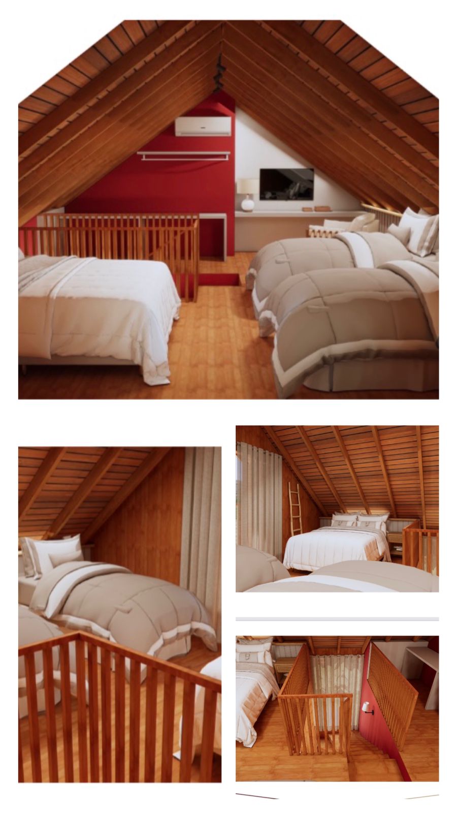 O espaço é composto por 7 chalés ao total, 1 principal que ficará os noivos, e outros 6 numa sequência. Em cada chalé acomoda até 6 pessoas. Vamos fazer o possível para organizar os dormitórios por famílias e grupos dos "mais conhecidos" para ficar mais confortável. Em anexo imagens do projeto de como serão os chalés (ainda estão em construção), então será um espaço novinho =)